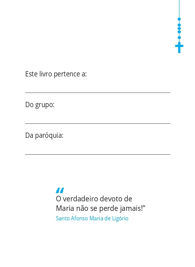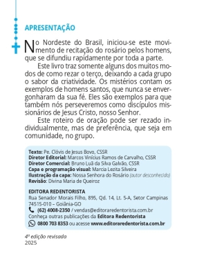 Quarta edição revisada deste subsídio para auxiliar na contemplação dos mistérios da vida de Cristo. Foi pensado especialmente para os grupos de Terço dos Homens. Mas, é um roteiro que pode ser rezado tanto em grupo quanto individualmente, segundo sua criatividade. Em cada mistério recorda um exemplo de homem que cultivou a devoção mariana como alimento de sua fé. Traz ainda cânticos para dinamizar a reza comunitariamente.